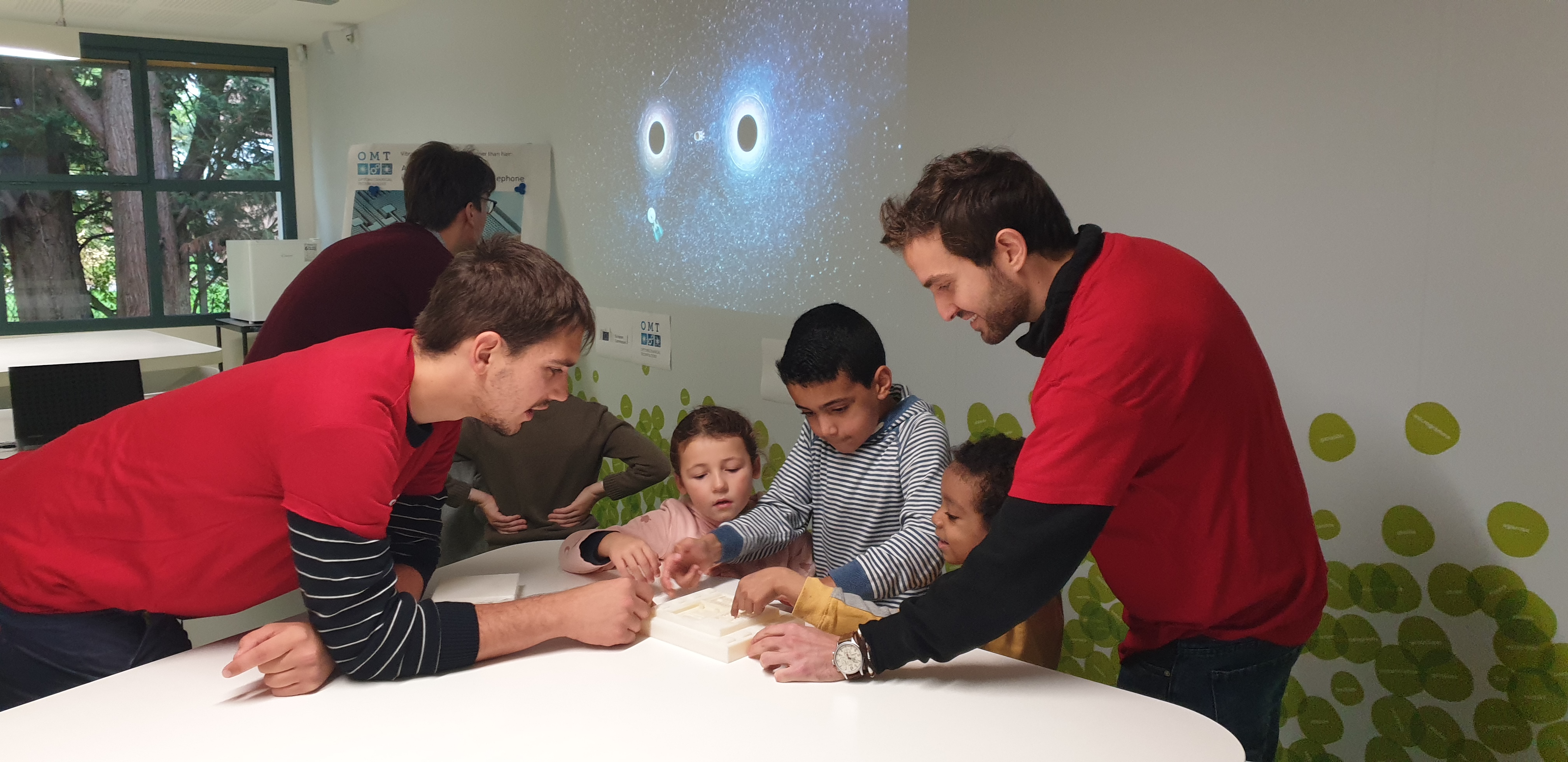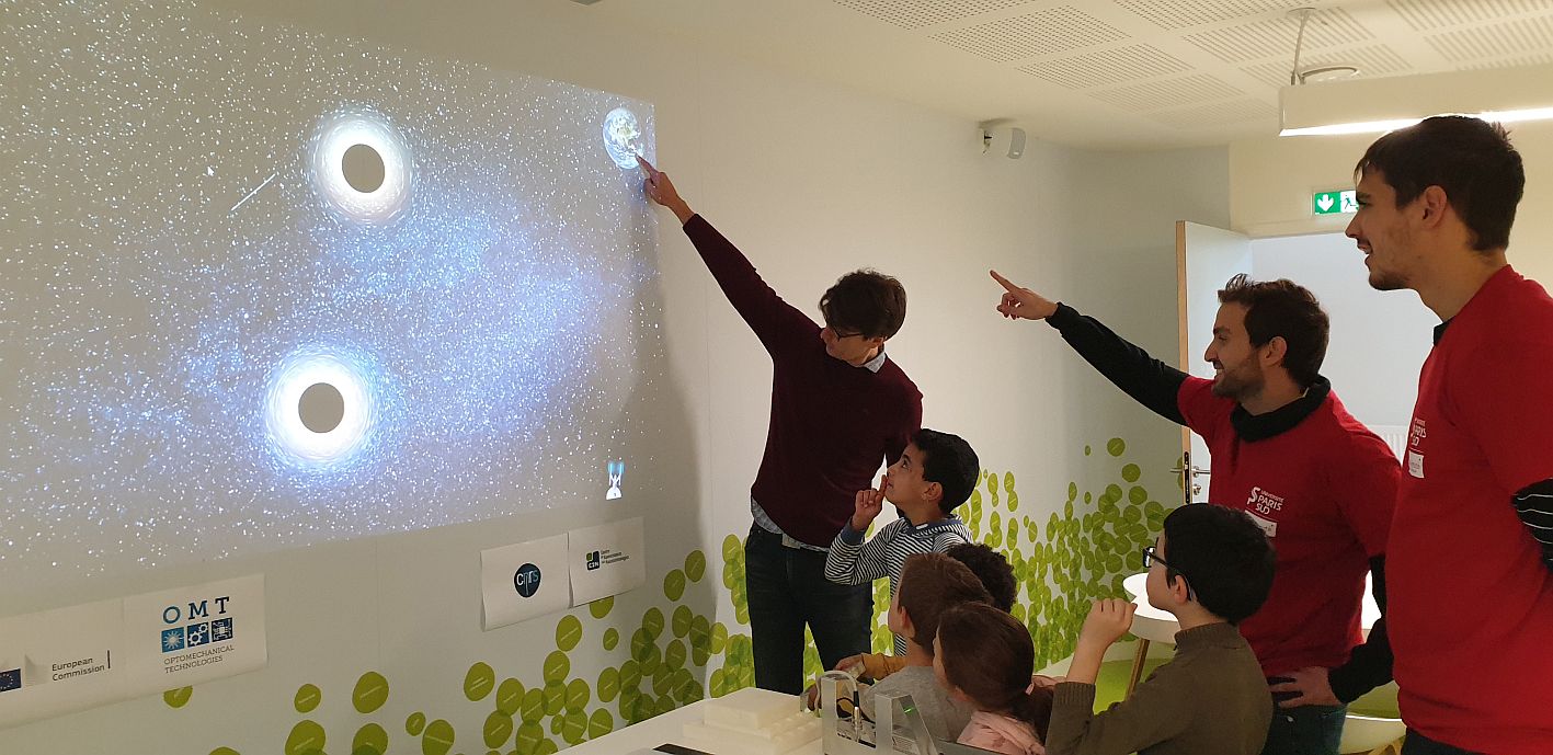 An interactive device representing hands-on information on micro-electromechanical accelerometers as used in smartphones and cars, the 'optomechanical technologies'. Such devices are commercially developed by BOSCH. The exhibit was developed by UHAM together with BOSCH. The device is a short video game called Save the Astronaut, whereby two black holes rotate around each other. Each black hole acts as a gravitational lens and moves the position of the stars in the background according to the Theory of General Relativity. Between the black holes is an astronaut, who was lost during a space-walk, and who will surely be swallowed by the black holes if not saved by a space ship. A visitor controls a steering wheel in his/her hands that allows to accelerate the space ship towards the astronaut and bring the astronaut safely back to earth. If the space ship comes too close to a black hole, however, it is stretched and swallowed. The exposition travels to different European cities within the consortium where the ESRs present the device at local events to demonstrate the importance and use of optomechanical technologies in our daily lives. The exhibit therefore targets parents together with their children, and young adults.