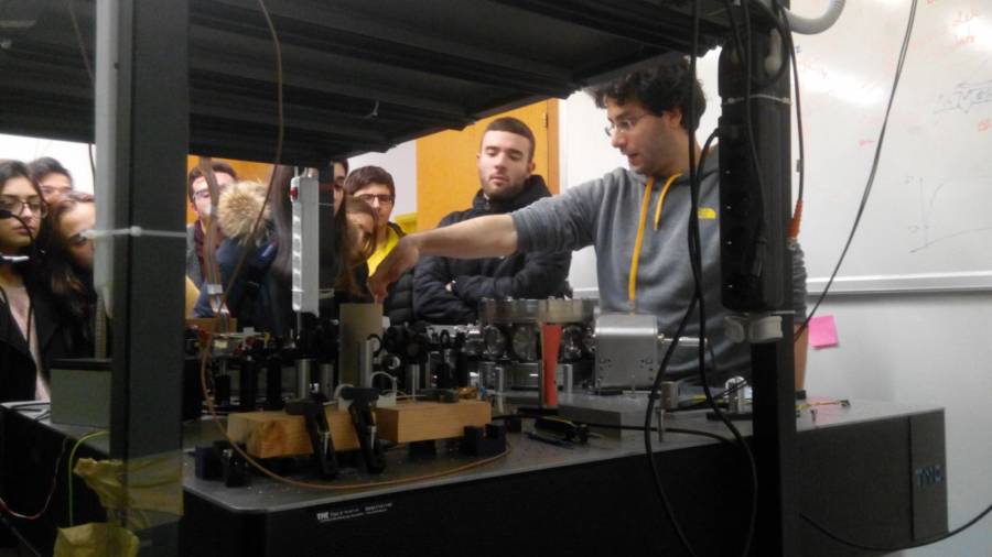 ESR Alberto Beccari giving a tour to high school students of the Optomechanics laboratory at EPFL